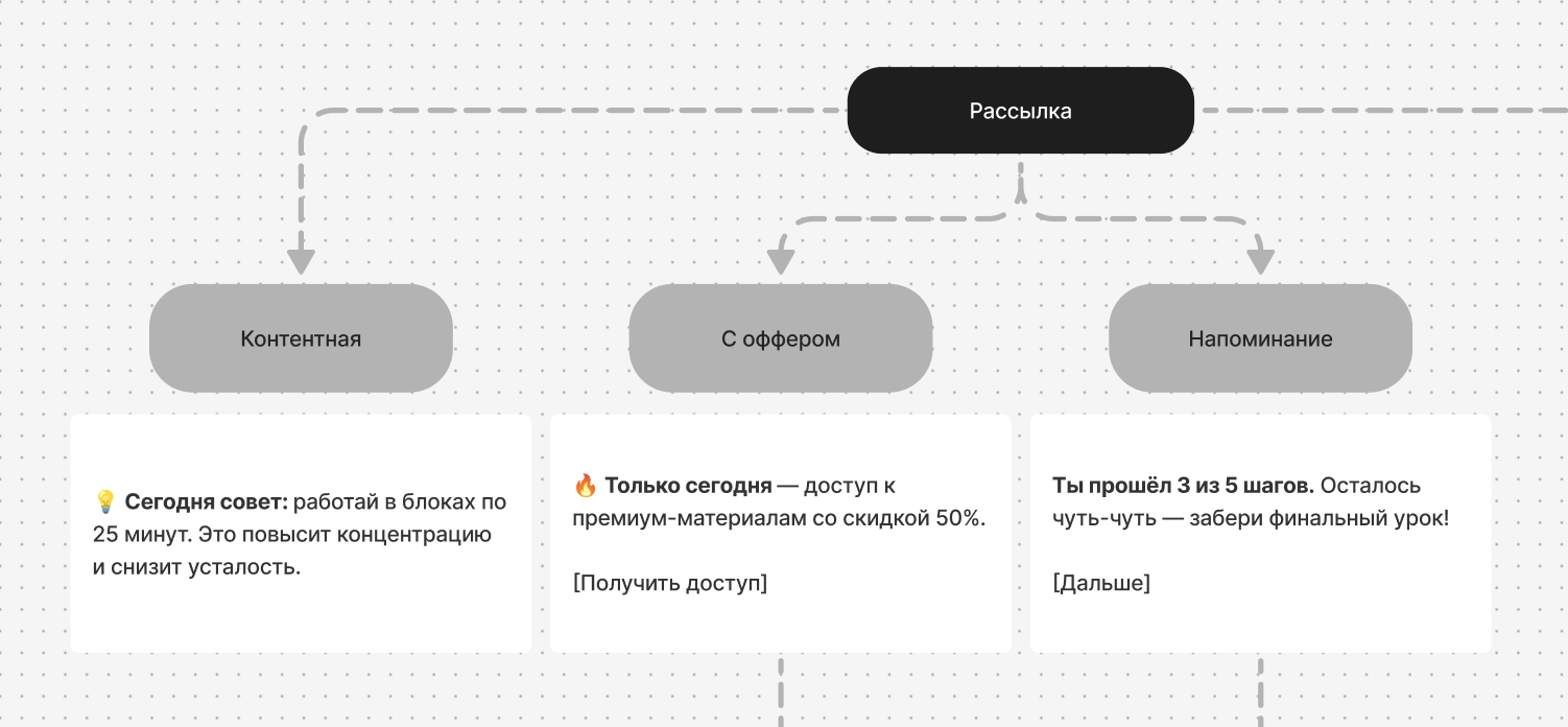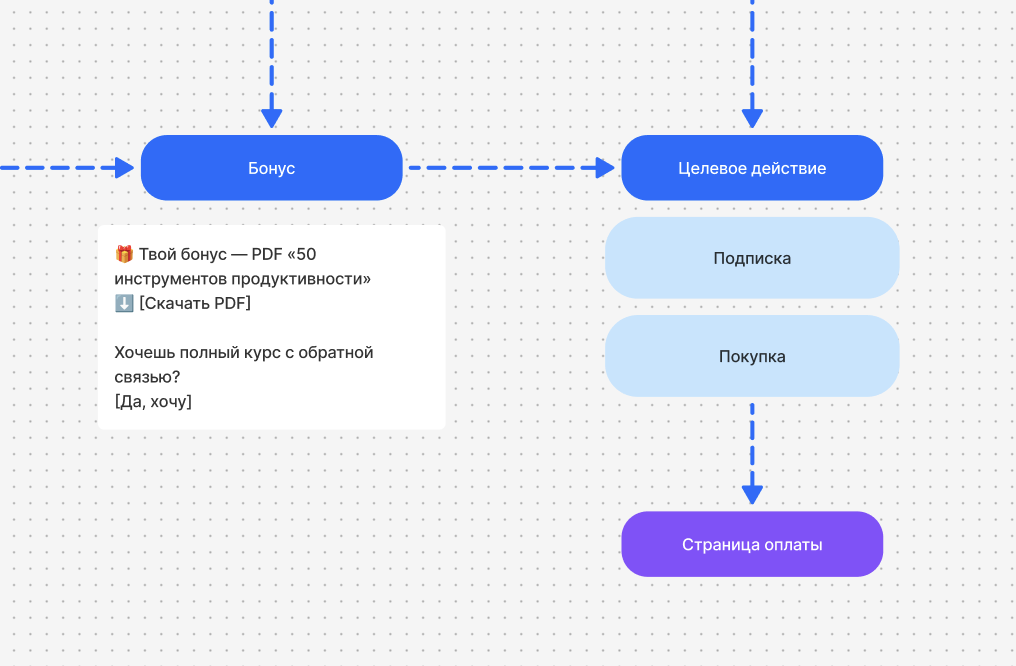 Между этими точками мы выстраиваем ветвления. Это как карта дорог: у нас есть повороты, развилки, короткие маршруты и длинные. Пользователь всегда должен понимать, куда он движется. Поэтому перед тем, как писать тексты, нарисуйте карту. Даже если это будет просто схема на бумаге или в программах, вы сразу увидите, где у вас тупики, где можно добавить бонус, а где уместно сделать предложение.