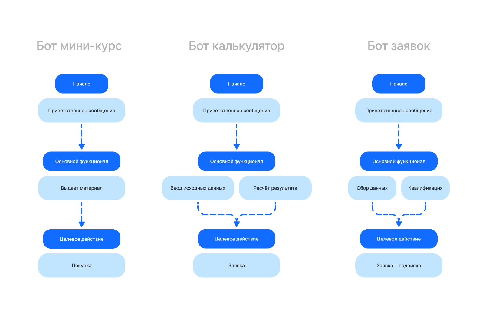 Любой бот начинается с логики. Здесь важно понимать три главных точки: вход, основной функционал и финал.